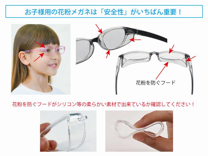 専用のフード(カバー)付きメガネなら、約90%以上の花粉をブロックできるというデータもあります。
